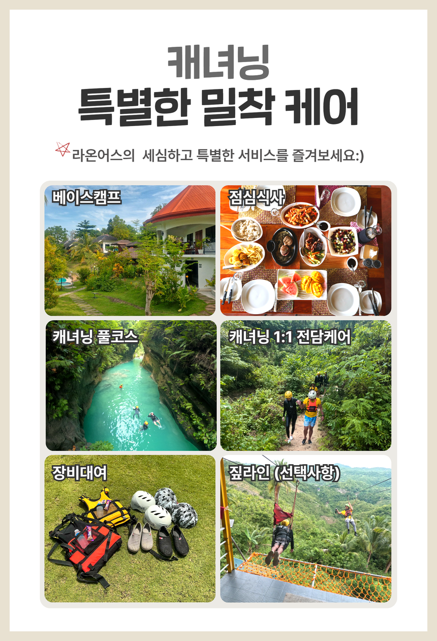 - 캐녀닝 장비(구명조끼, 헬멧, 아쿠아슈즈)