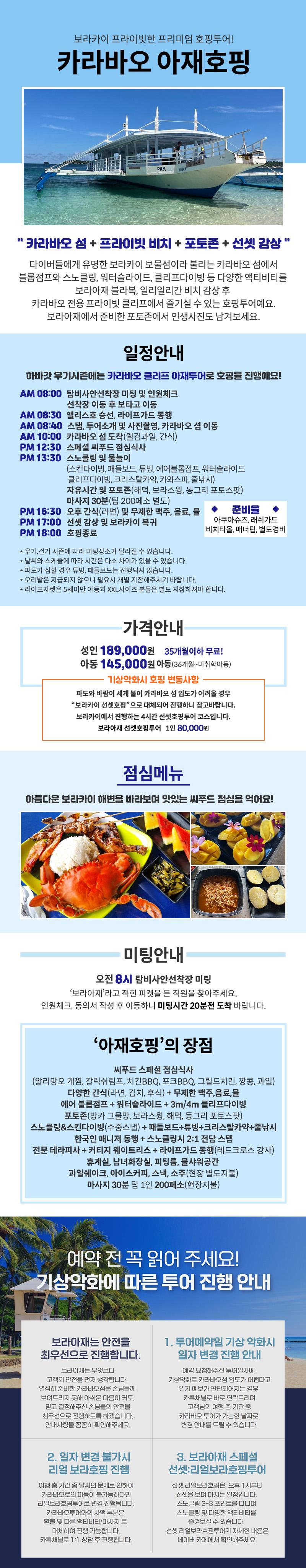= 무료인 유아는 식사제공이 없습니다. 단 무료인 유아도 호핑이 끝난후 별도 매너팁 200페소 주셔야합니다.