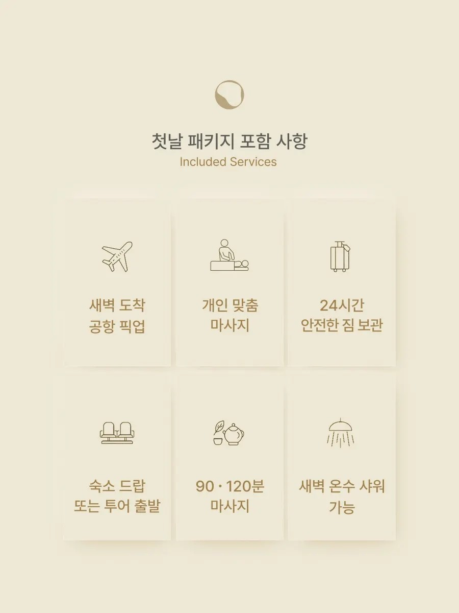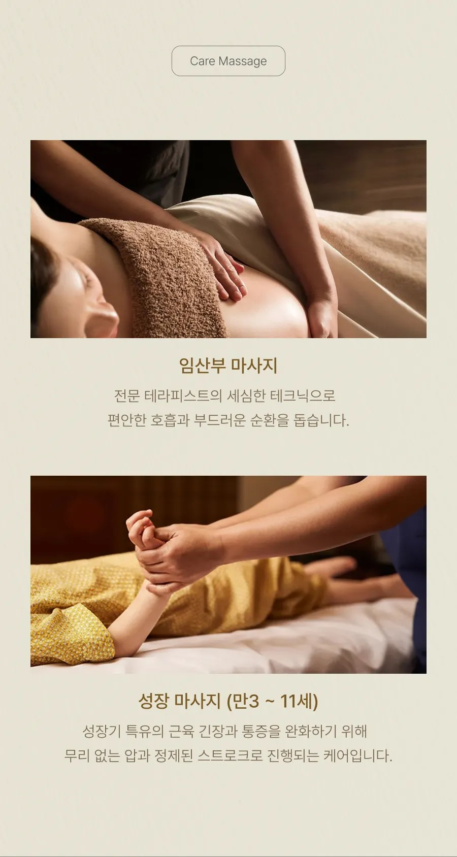 **만 3세 이상 아동:** 마사지를 받지 않는 경우, 다른 고객님들의 휴식과 쾌적한 환경을 위해 **로비 대기를 권장**해 드리고 있습니다. 다만, 현장 상황에 따라 **최대한 유연하고 편안하게** 입실을 도와드리겠습니다.