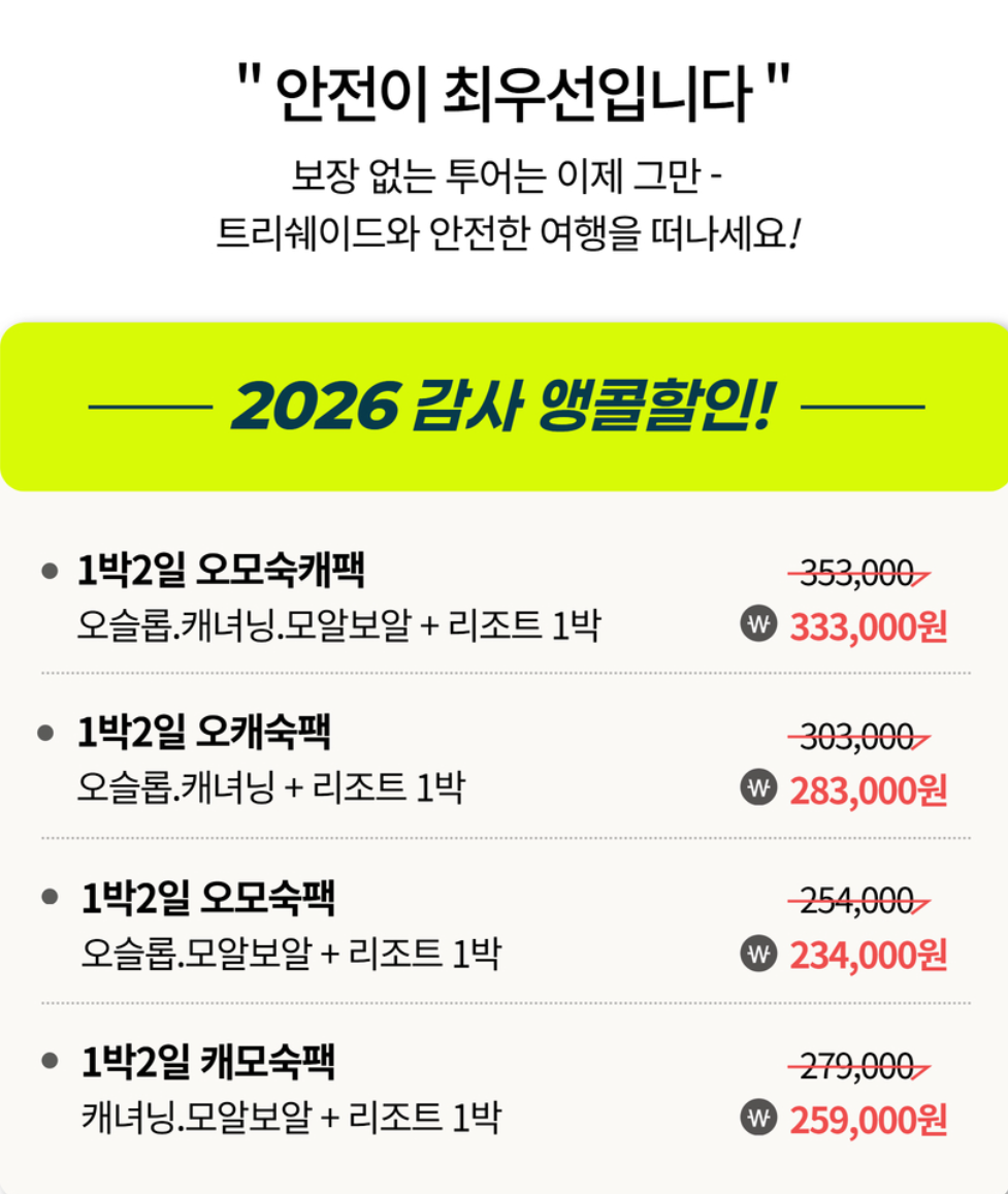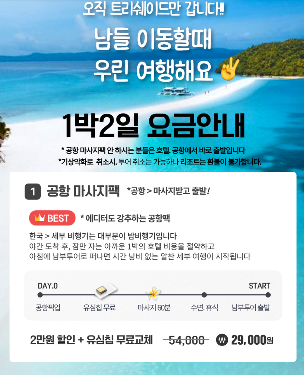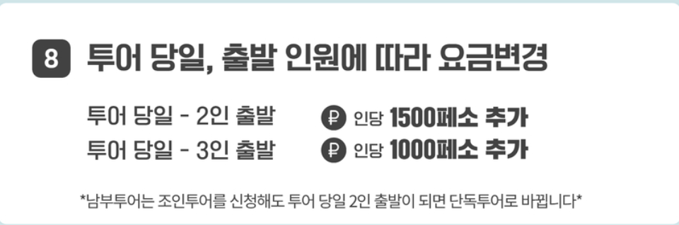기상악화로 인한 투어는 취소가 가능하나 숙박1박은 취소가 안되는점 양해부탁드립니다